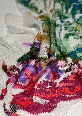 In sampling, there seems to be a kind of central space that you then build around. The main consideration is the shape and form of the central space and the ripples that come out of there. I ended up experimenting with fabric in the form of beads and interacting with my body to create a video of my mental space-changing process, through which I can see the flow of colour as my body moves and relaxes.